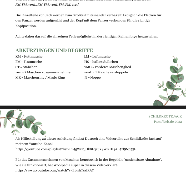 “Schildkröte Jack” ist ein Design von Die Häkelschafe (Pamela Gohra) und die Anleitung ist nur für den privaten Gebrauch zu benutzen. Die Anleitung darf nicht verkauft, weitergeschickt, mit anderen getauscht, reproduziert, veröffentlicht oder in andere Sprachen übersetzt werden.