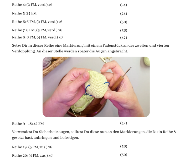 Beachte, dass Häkeltiere zu den Spielzeugen zählen und auf dem europäischen Markt nicht ohne CE-Kennzeichnung und entsprechende Prüfung in Umlauf gebracht werden dürfen. Das gilt auch für Einzelanfertigungen und Verkäufe auf Märkten.